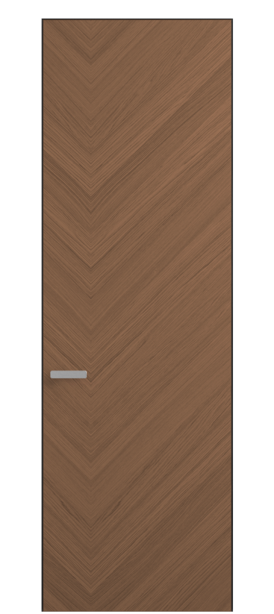 Полотно Рифт в скрытом алюминиевом коробе становится полноценным элементом декора. В коллекции представлено 9 моделей дверей в высоте до 3 метров. Рисунок раскладки шпона варьируется от простого до сложного. «Рубашка» для каждого полотна подбирается вручную по цвету, текстуре и фактуре.